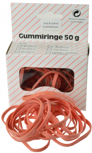 50 Gramm rote Gummibänder mit einer Länge 130 x 4 mm und einem Durchmesser von 80 mm